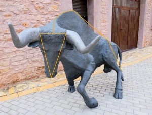 La cabeza girada hacia un lado aumenta la sensación de violencia dirigida al objeto del ataque. La cara del toro dibuja un triángulo isósceles; es la única geometría simétrica en toda la escultura que nos proporciona sensación de equilibrio.
