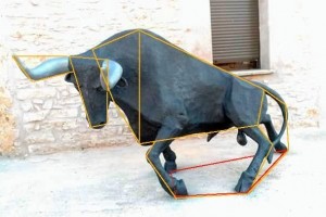 Finalmente, destacan tres elementos curvos situados, dos de ellos, en el comienzo de la escultura y el otro, en el final: dos curvaturas abiertas ascendentes (las astas o cuernos) y una curvatura descendente y cerrada (el rabo). Más sensación de movimiento escultural. Toda la escultura es movimiento. Como si fuera a salir galopando en cualquier momento.