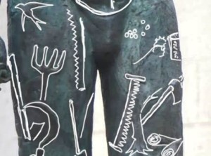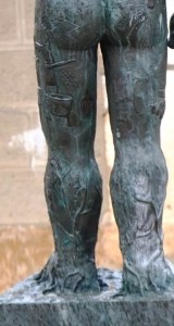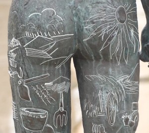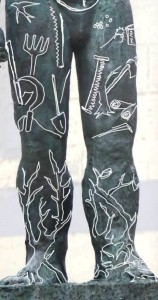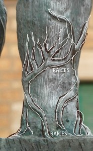 Surgen desde la base unas extremidades voluminosas, robustas y fuertes (bronce), ancladas al suelo mediante profundas raíces, simbolizando la unión del hombre con su tierra, por ser el lugar de nacimiento y el espacio en el que ha desarrollado su historia vital y de la que ha recibido los nutrientes culturales. Es un ser nacido del vientre de esta tierra, de su materia (mater, madre) guileta