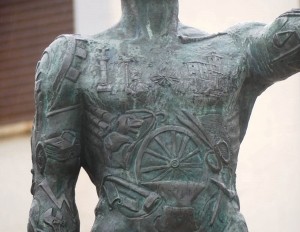 - En la mano derecha, orientada hacia el suelo, lleva el pergamino real, que acredita la autorización para crear ayuntamiento propio, motivo por el que lucharon sus vecinos hasta conseguirlo. La industria, la tecnoligia, etc